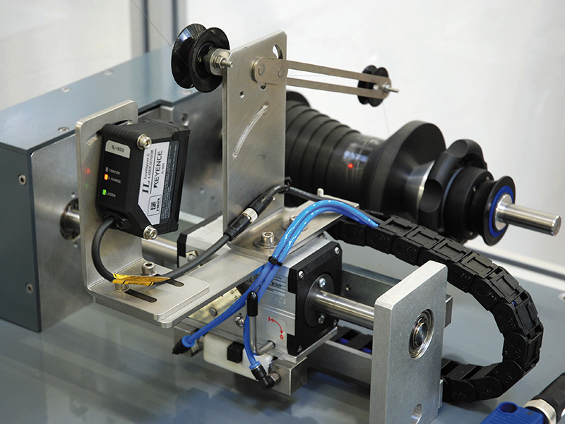 Mientras que el sistema transversal se mueve, la distancia de referencia se compara continuamente con el valor medido. La inversión se dispara tan pronto como la desviación de altura permisible y ajustable se excede. Tal desviación de altura ocurre cuando se detecta la valona o una acumulación de material en el carrete.